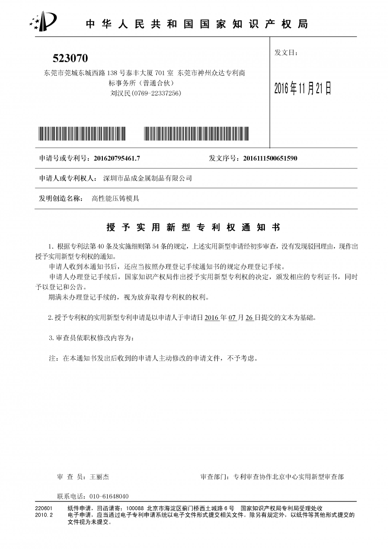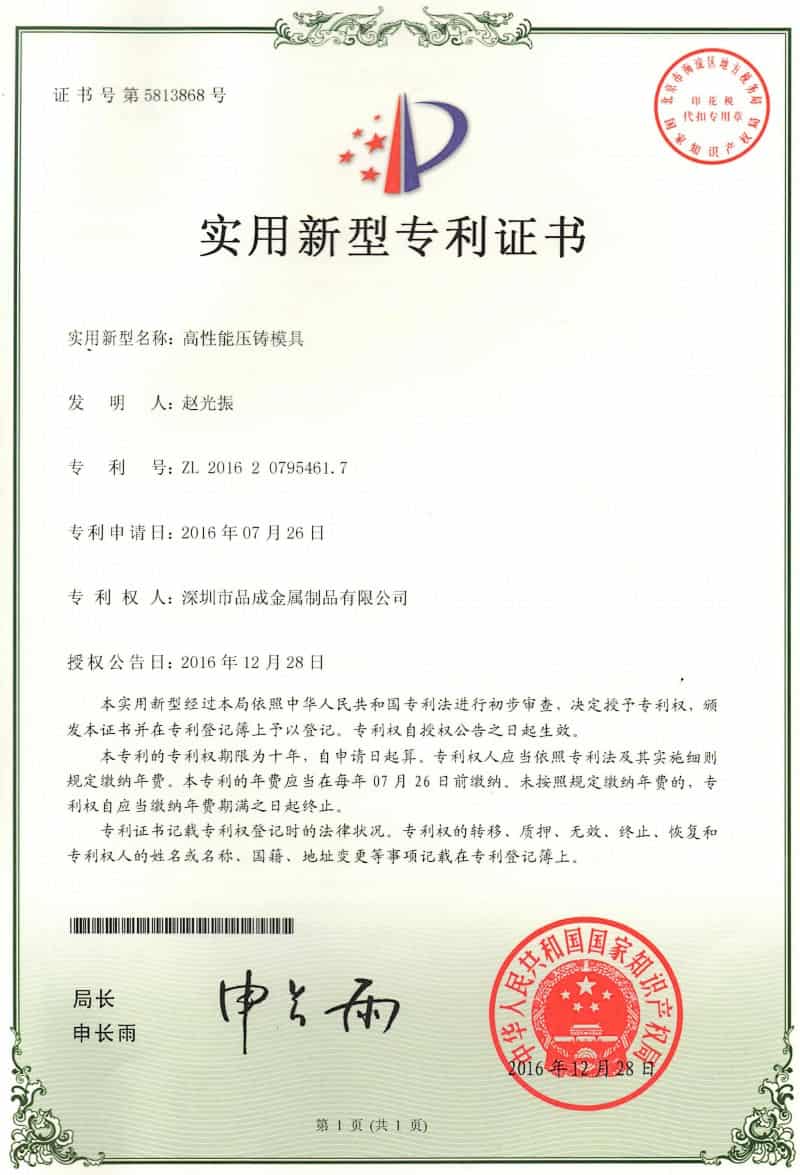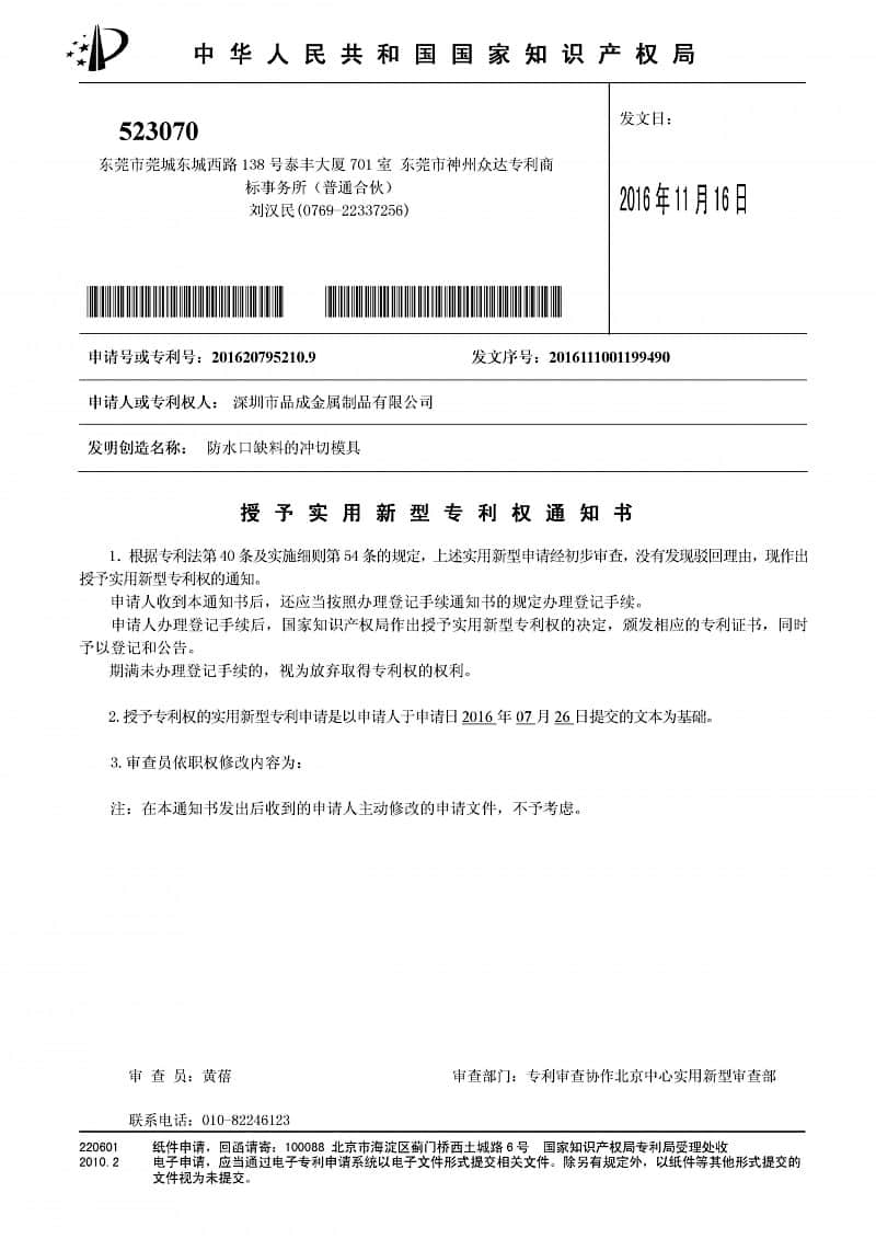 導語: 2016年11月,我司自主研發的兩項實用新型專利——“防水口缺料的沖切模具”、“高性能壓鑄模具”,被國家知識產權局正式授權。2017年1月,正式收到此兩項實用新型專利證書。