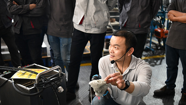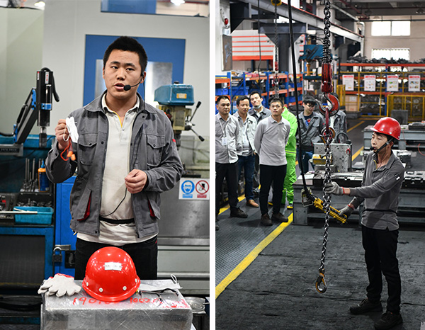 逃生演習結束后,全體分為三個小組進行實操演練。所有項目采用循環演示方式,保證所有員工都可以觀看到完整的實操演練。演練項目包括:搬運鐵桶的注意事項、防護用品的標準佩戴方式、翻模的注意事項、叉車和行車的正確使用、磨床區的安全操作、用電安全、機器維護常識、壓鑄機的周邊隱患等。實操演練是對于理論安全知識的一種具象再現,加強了生產安全的學習和記憶。