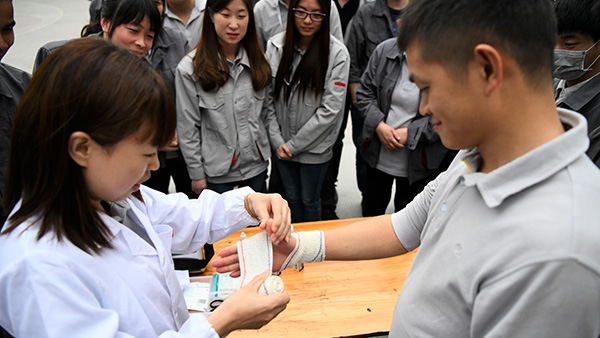 結束安全實操演練,進入“救護技能應用和消防器材使用”環節。公司指派專人進行指導演練,演練內容包括如何正確報警、包扎的注意事項、安全繩的正確打結方式、消防栓以及滅火器的使用。