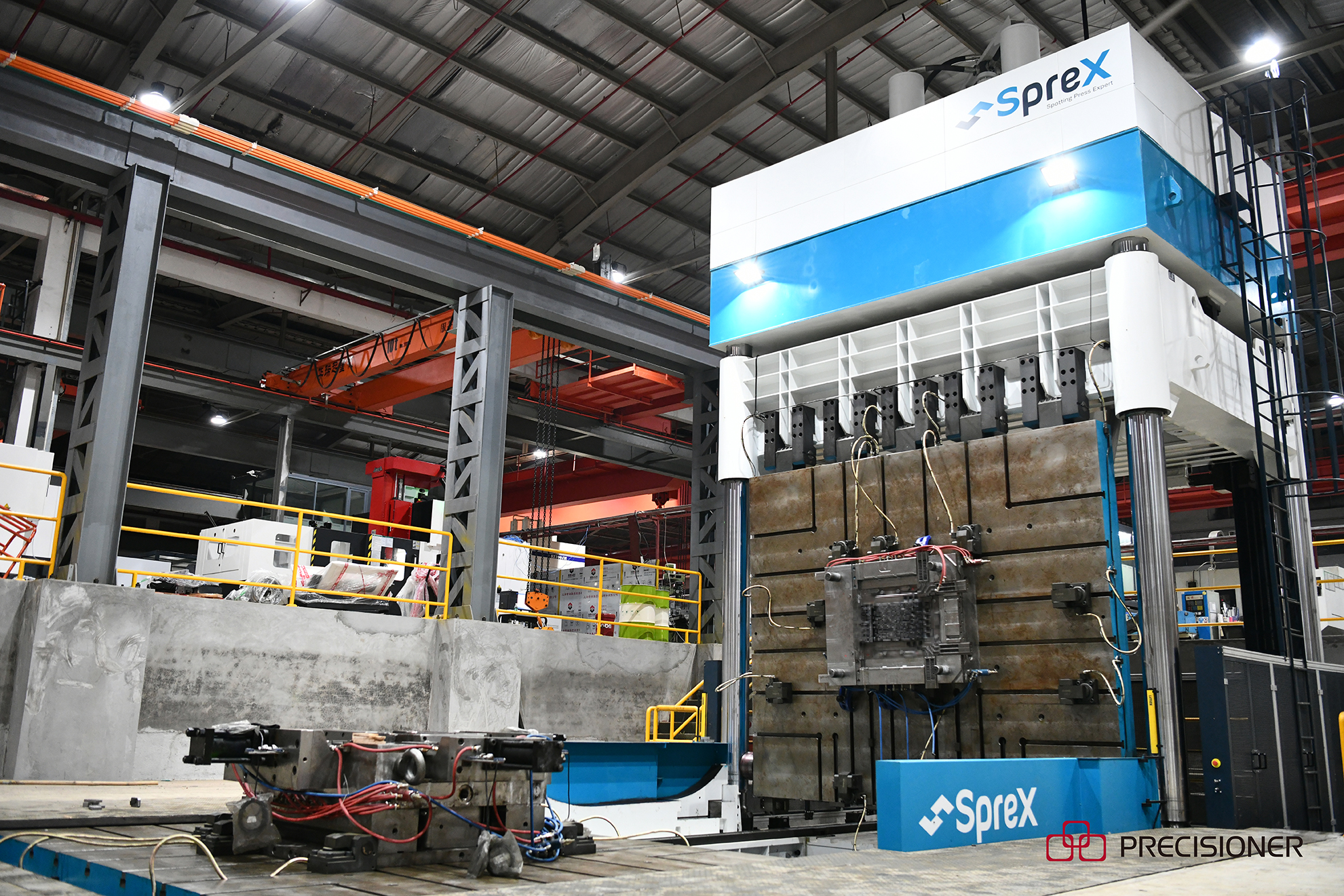 800T大型合模機可容模尺寸為4.2×3.5M,合模重量190T,翻轉(zhuǎn)能力105T,可以配4000-8000T的模具。該臺合模機體量較大,機身11.9米約三層樓高,占地約100平方米,現(xiàn)場觀摩大型合模機工作畫面相當(dāng)壯觀。