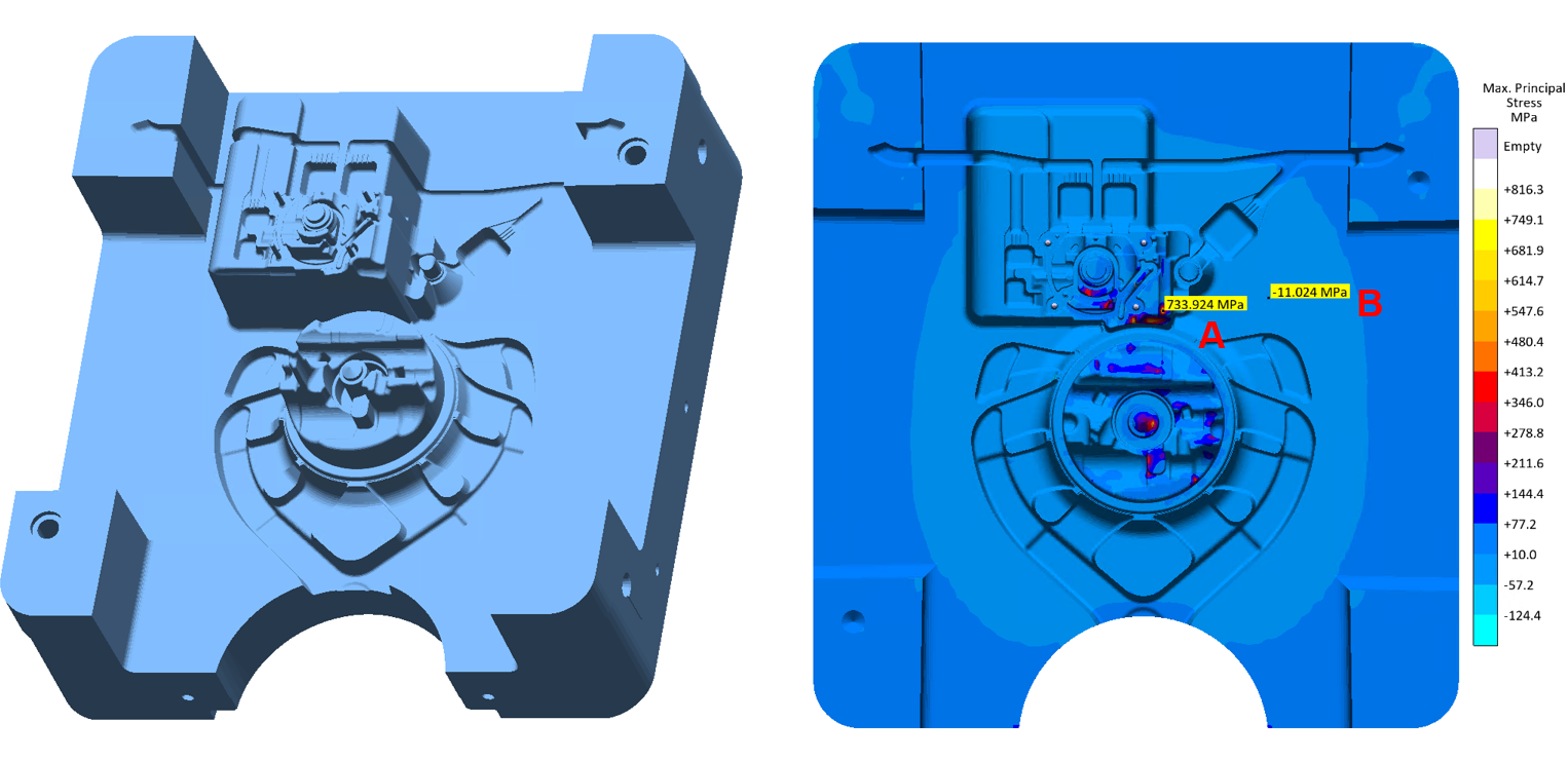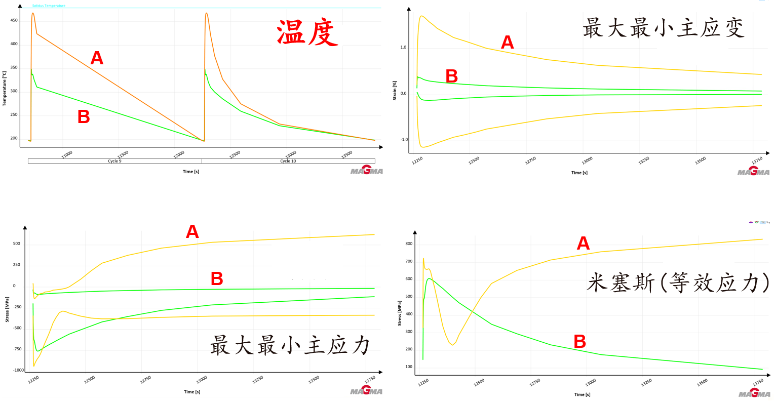 如圖7a右圖所示,在模具表面取A,B兩點(diǎn)。其中A點(diǎn)為缺陷位置,B點(diǎn)為無缺陷位置,結(jié)果顯示A點(diǎn)的最大主應(yīng)力大于B點(diǎn)。結(jié)合應(yīng)力曲線結(jié)果可以觀察到,A點(diǎn)的溫度高于B點(diǎn),A點(diǎn)的最大最小主應(yīng)力差值大于B點(diǎn),最大最小主應(yīng)變和米塞斯應(yīng)力曲線結(jié)果也呈現(xiàn)相同情況。
